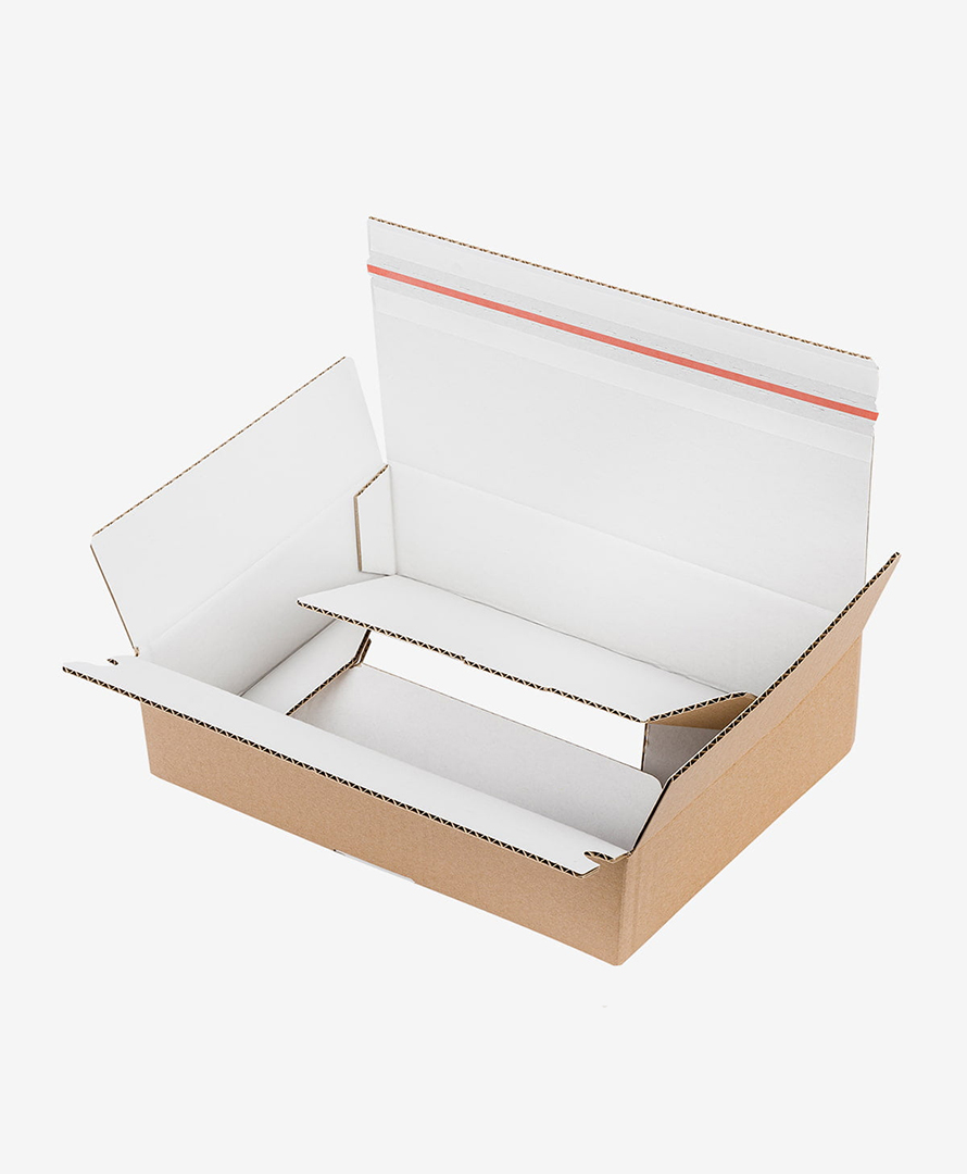 För att underlätta både leverans och retur är kartongen utrustad med två självhäftande tejpremsor: en för att stänga vid utskick och en andra för returer. Tack vare den integrerade rivtejpen kan mottagaren öppna paketet snabbt och säkert, utan verktyg.